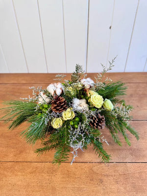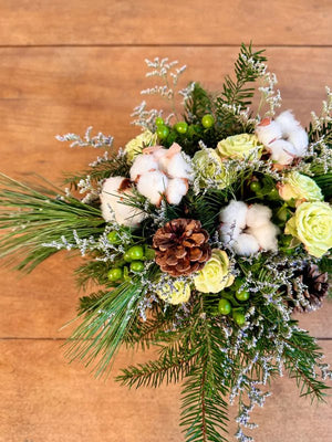 Laissez-vous charmer par notre centre de table Noël boréal, imaginé spécialement pour créer une atmosphère magique et résolument festive. Composé de fleurs soigneusement sélectionnées, de pommes de pin et de feuillages verdoyants, il apporte instantanément élégance, chaleur et lumière à votre décor.