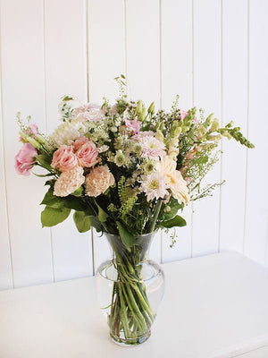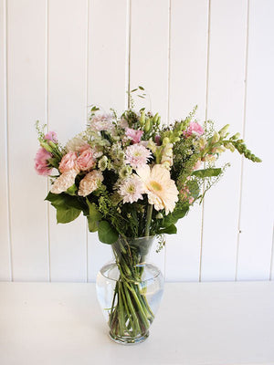 Chaque fleur sélectionnée pour nos bouquets est choisie pour sa fraîcheur et sa durabilité, garantissant que votre arrangement floral restera beau et vibrant pendant longtemps. Les nuances douces de blanc et de rose pâle s'associent parfaitement, créant un effet calmant et une atmosphère accueillante qui embellira votre quotidien.