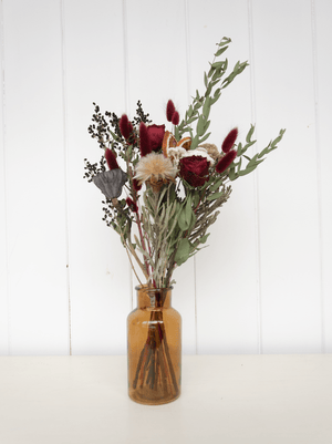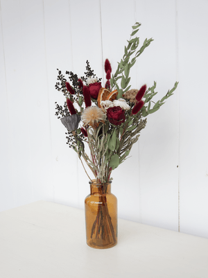 Conçu spécialement pour célébrer la magie du temps des fêtes, Noël enchanteur est un bouquet de fleurs séchées où le rouge profond des roses se mêle à l’éclat délicat d’immortelles locales. Les tranches d’orange sanguine séchées, le lotus et l’eucalyptus ajoutent une touche parfumée et légèrement mystérieuse, composant une ambiance chaleureuse, idéale pour illuminer votre décor et vos événements festifs de fin d'année.