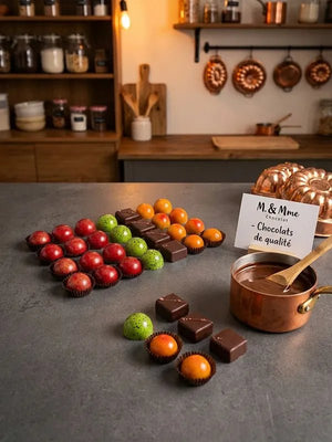 Découvrez les délicieuses créations artisanales de M. & Mme Chocolat : des assortiments de chocolats fins offerts en boîtes de 5 ou 10 chocolats à déguster.
